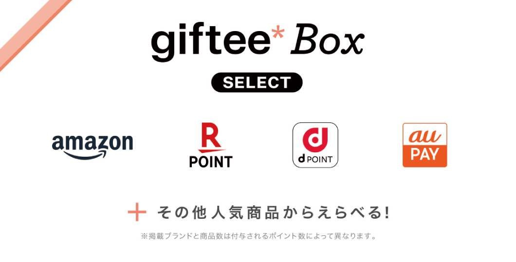 ●ラインナップの中から好きな商品と交換できるデジタルギフト(gifteeBoxSelect)を、普通・小型自動車(新車):20,000ポイントまたは、軽乗用車(新車)または中古車:10,000ポイントを付与します。ラインナップおよび交換に必要なポイントは付与されたgifteeBoxSelectにより異なり、変更になる場合がございます。またgifteeBoxSelect内のポイント交換レートは商品により異なります。記載された必要ポイント数をよくご確認の上、商品と交換してください。